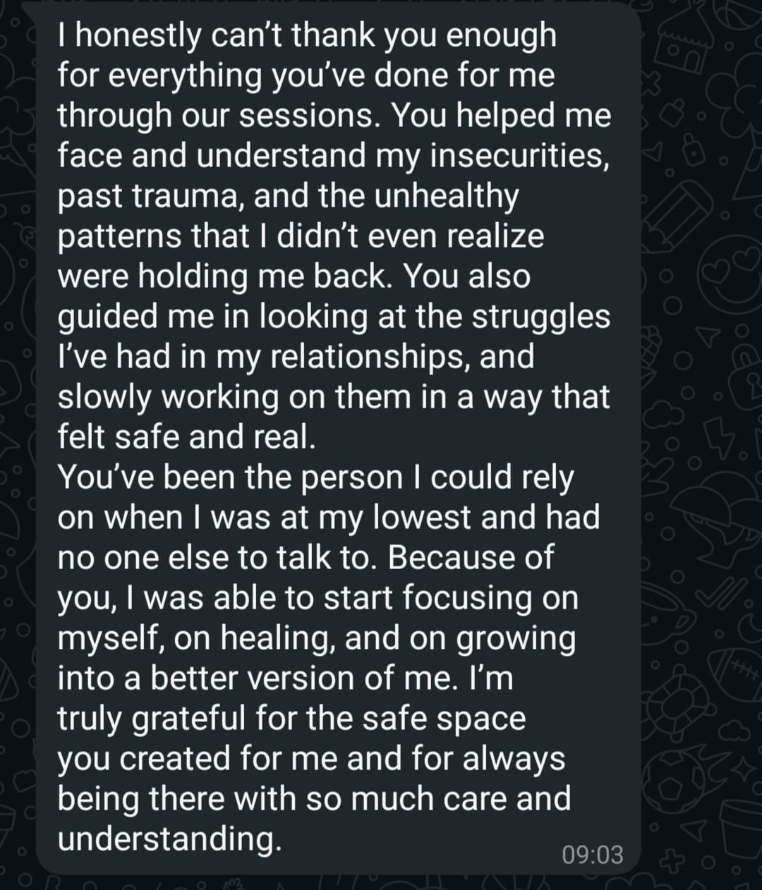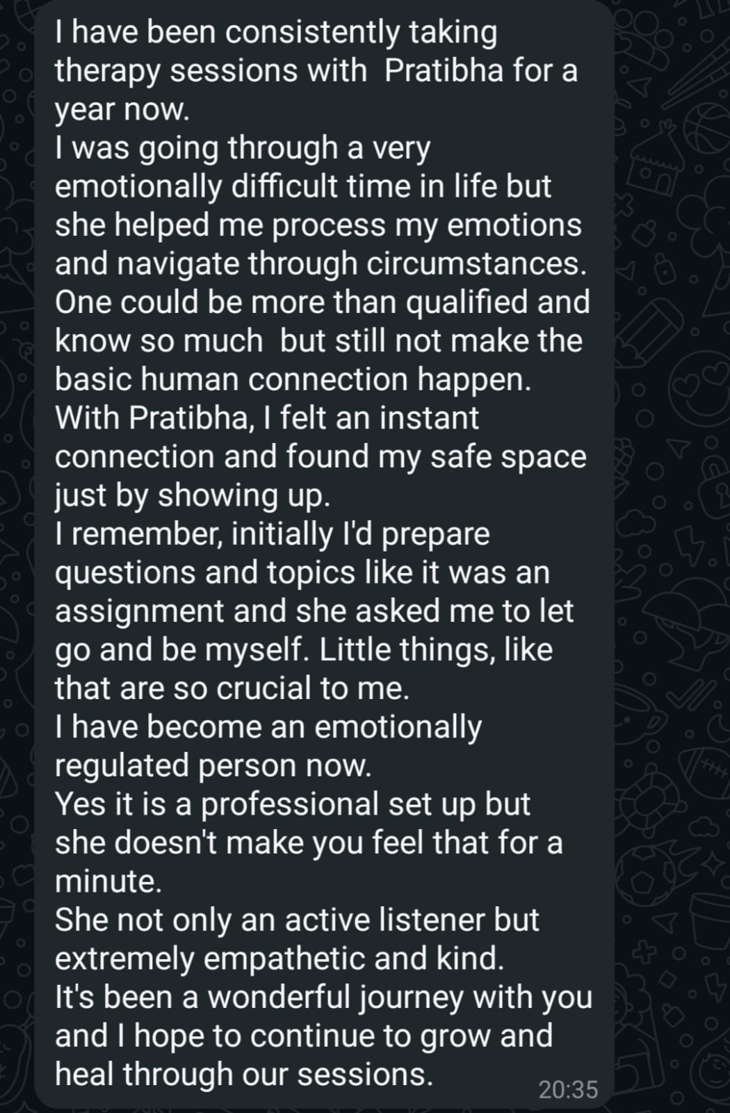 Hi, and welcome. I’m Pratibha, a Counseling Psychologist with a Master’s in Clinical Psychology and over 350 hours of experience working with adults. I blend a range of therapeutic approaches to meet your unique needs, supporting those facing anxiety, low mood, grief, stress, low self-esteem, or life changes. In our sessions, you can expect a safe, compassionate space where your experiences are valued and your growth nurtured—so you can leave feeling empowered, understood, and ready to move forward with clarity and confidence.
